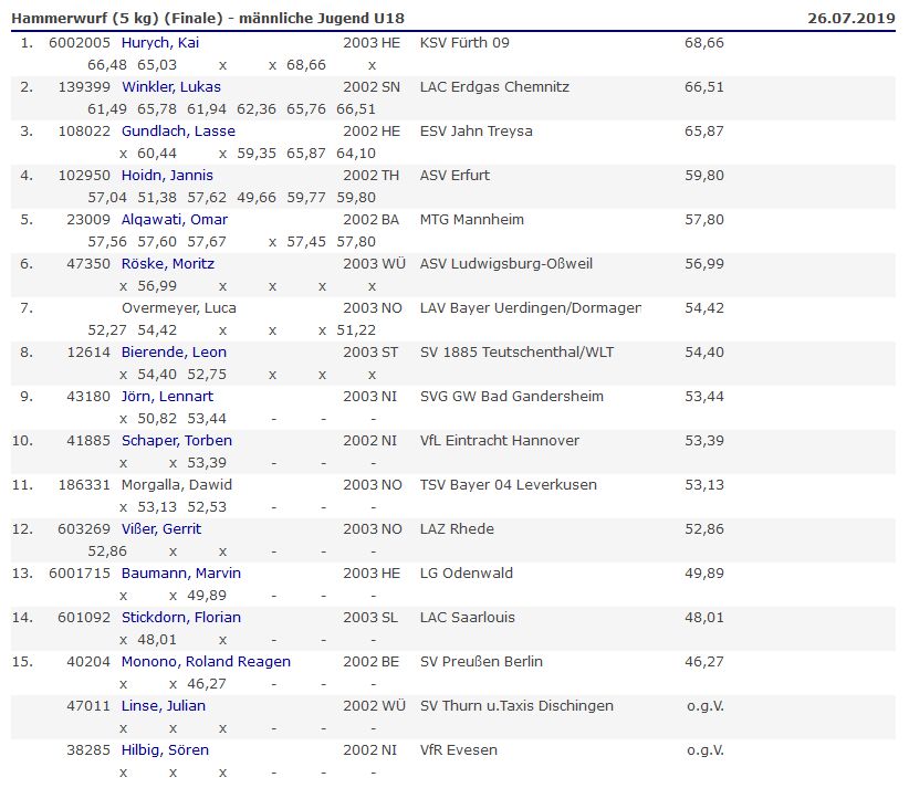 In einem Wettkampf mit vielen ungültigen Würfen, gewann wieder einmal der Odenwälder Kay Huryich, vor Lukas Winkler aus Sachsen und Lasse Gundlach aus Hessen.