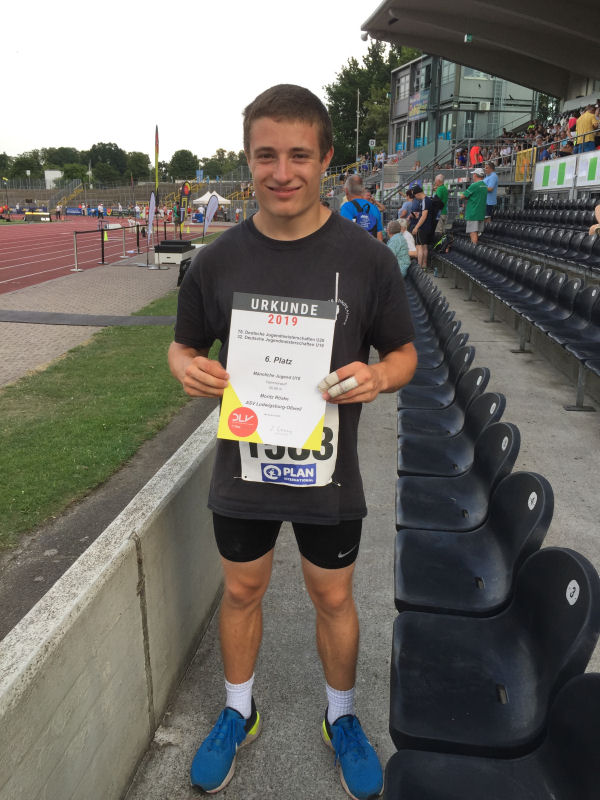 Ulm(26.7) Bei den deutschen Jugendmeisterschaften belegte Moritz Röske bei der B-Jugend einen hervorragenden 6. Platz im Hammerwurf. Mit einer neuen persönlichen Bestleistung von 56,99 Meter überzeugte er in Ulm und bestätigte seine Leistungen aus dem Training.